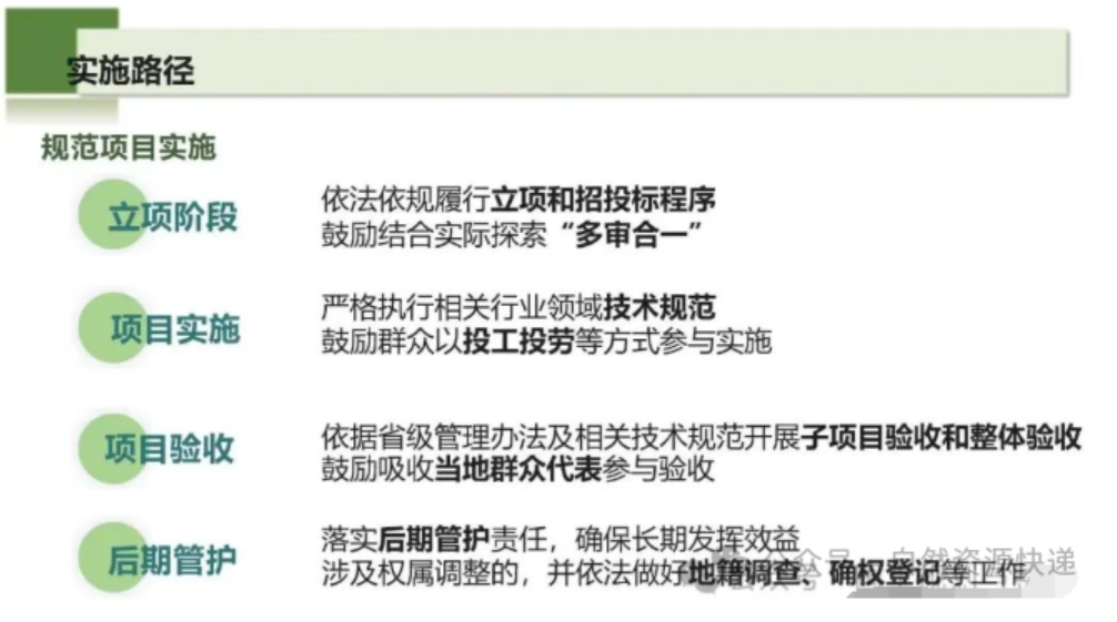 2. 实施路径篇:从规划到落地的“施工图” - 县域统筹:如何划定整治单元?怎么调研群众意愿?(附调查表单模板); - 实施方案编制:目标设定、子项目安排、权属调整(含宅基地“三权分置”案例); - 项目管理:立项备案→组织实施→竣工验收(新增耕地实测标准、后期管护责任划分)。