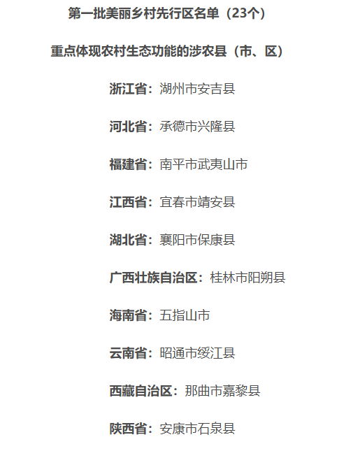 第一批美丽乡村先行区名单日前公布,浙江安吉等23个县(市、区)入选(具体名单见附图)。