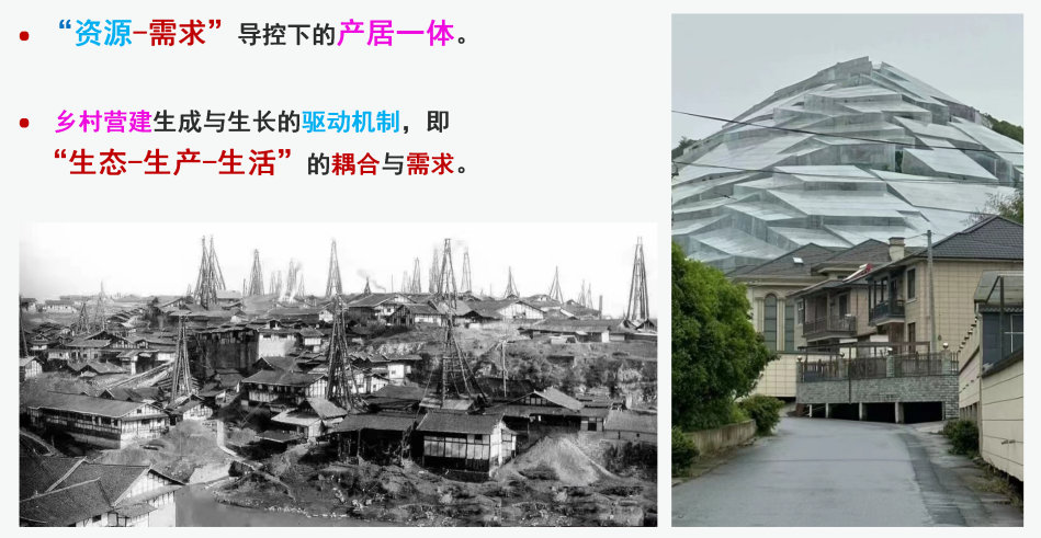 古法“井盐开采”所塑造的产居复合聚落,与当下临安为“杨梅大棚”而调整的土地利用和基础设施布局,虽然技术天差地别,但内核一致,在“资源-需求”导控下实现“产居一体”的逻辑线索上,则是一脉相承。以上反映出的乡村营建生成与生长的驱动机制,即“生态-生产-生活”的耦合与需求。(图4)