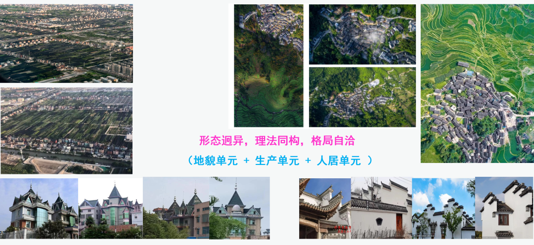 传统乡村的空间格局是其适应自然、组织生产与安置生活的系统性集中体现。无论是绍兴地区顺应水系脉络形成的“水肌”型网络格局,还是徽州地区依循山地溪流构建的“坡坑”式聚落单元,其各自独特空间形态的生成动因,皆是“地貌单元” (生态)、“生产单元” (经济)与 “人居单元” (社会)高度融合的产物。(图3)这里充分揭示了乡村营建的底层逻辑,即:形态迥异,理法同构,格局自洽。它绝非单一维度的形态操控,而是对人-地关系的生态适应与资源利用、人-产关系的经济模式与生计方式,以及人-人关系的社会组织与家族伦理的整体性回应。