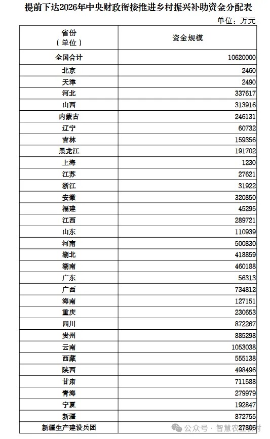 此次资金覆盖31个省(区、市)及新疆生产建设兵团共计32个单位,分配规模从1230万元至105.3亿元不等,呈现出鲜明的区域差异化投放特征,彰显了"精准滴灌"的政策导向。