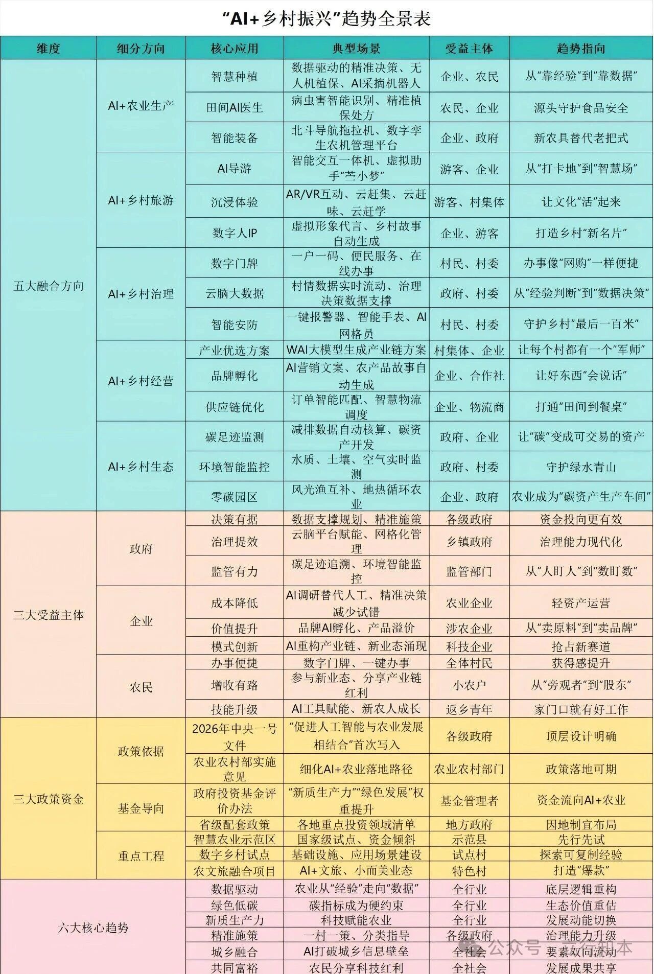 与此同时,文件还在“培育壮大县域富民产业”部分提出,统筹发展科技农业、绿色农业、质量农业、品牌农业,深化农文旅融合,推进乡村旅游提档升级,发展“小而美”文旅业态。这些都为AI与乡村的深度融合打开了想象空间。为此,我们总结出“AI+乡村旅游”趋势“5336”全景表。
