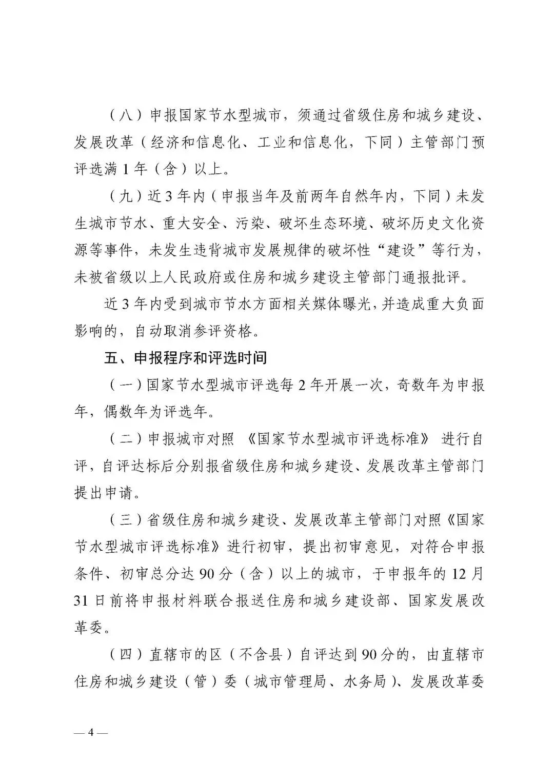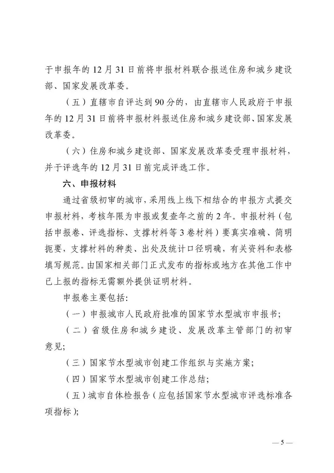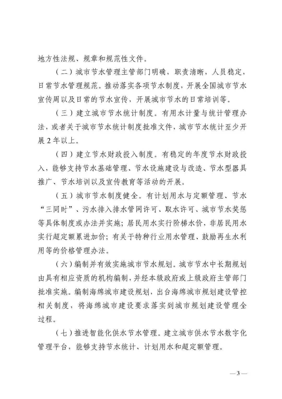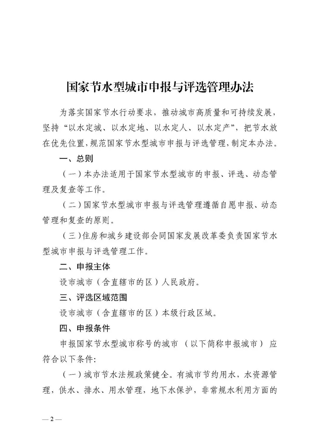 住房和城乡建设部 国家发展改革委关于印发 建城〔2022〕15号 各省、自治区住房和城乡建设厅、发展改革委,直辖市住房和城乡建设(管)委(城市管理局)、水务局、发展改革委,海南省水务厅,新疆生产建设兵团住房和城乡建设局、发展改革委: 现将修订后的《国家节水型城市申报与评选管理办法》印发给你们,请遵照执行。 住房和城乡建设部 国家发展和改革委员会 (此件公开发布) 《办法》主要内容如下: