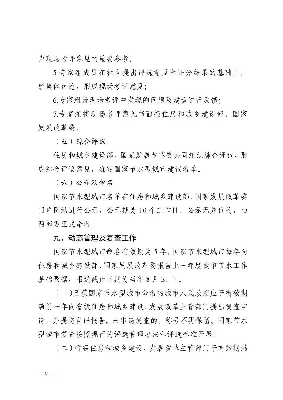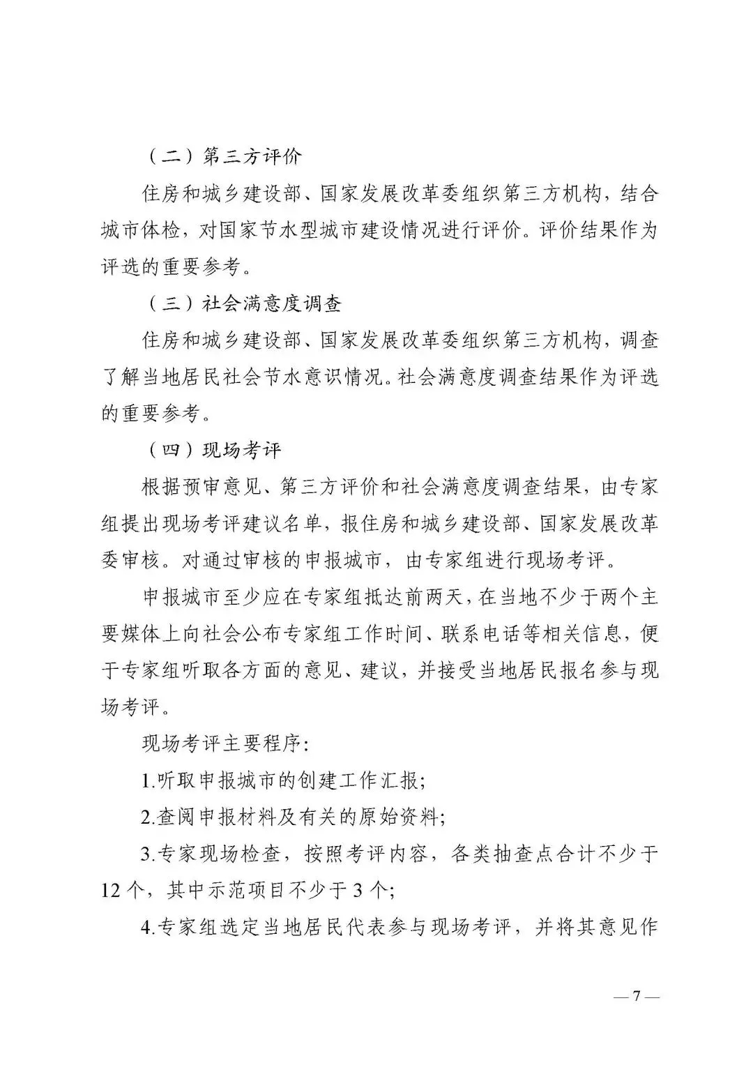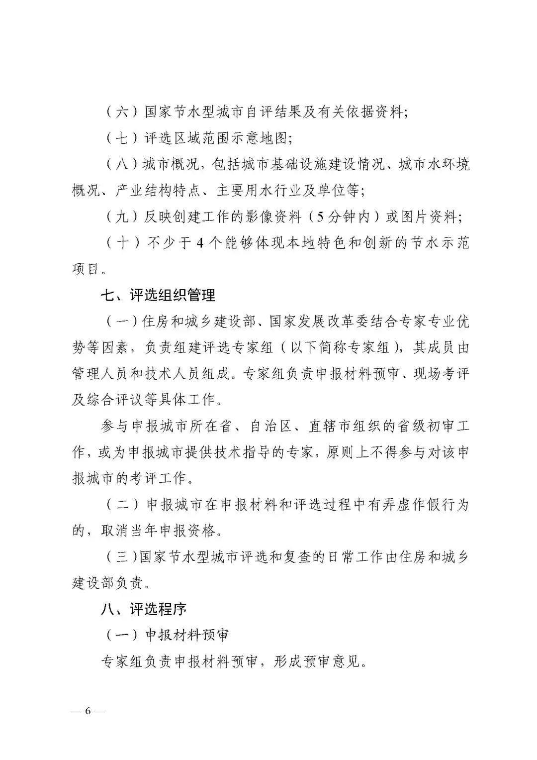 《办法》明确,国家节水型城市评选包括申报材料预审、第三方评价、社会满意度调查、现场考评、综合评议、公示及命名等环节。住房和城乡建设部、国家发展改革委负责组建评选专家组,其成员由管理人员和技术人员组成。专家组负责申报材料预审、现场考评及综合评议等具体工作。申报城市在申报材料和评选过程中有弄虚作假行为的,取消当年申报资格。