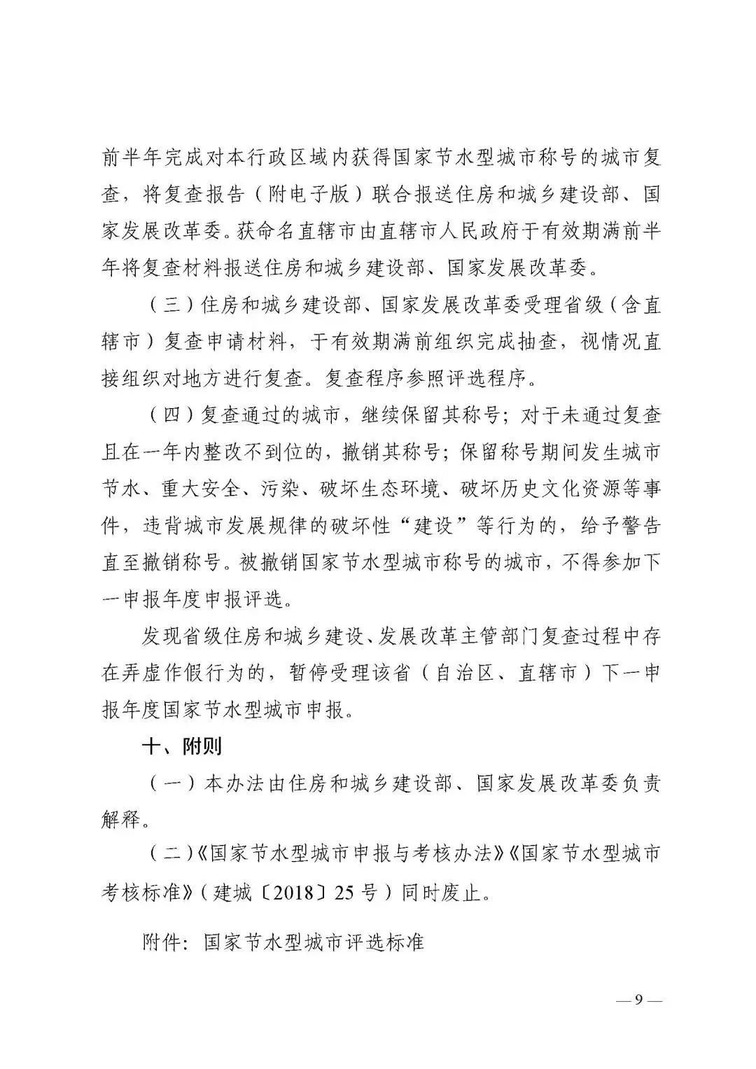 《办法》规定,国家节水型城市评选每2年开展一次,奇数年为申报年,偶数年为评选年,命名有效期为5年。已获国家节水型城市命名的城市人民政府应于有效期满前一年提出复查申请。未申请的,不再保留称号。复查通过的城市,继续保留其称号;对于未通过复查且在一年内整改不到位的,撤销其称号;保留称号期间发生城市节水、重大安全、污染、破坏生态环境、破坏历史文化资源等事件,违背城市发展规律的破坏性“建设”等行为的,给予警告直至撤销称号。